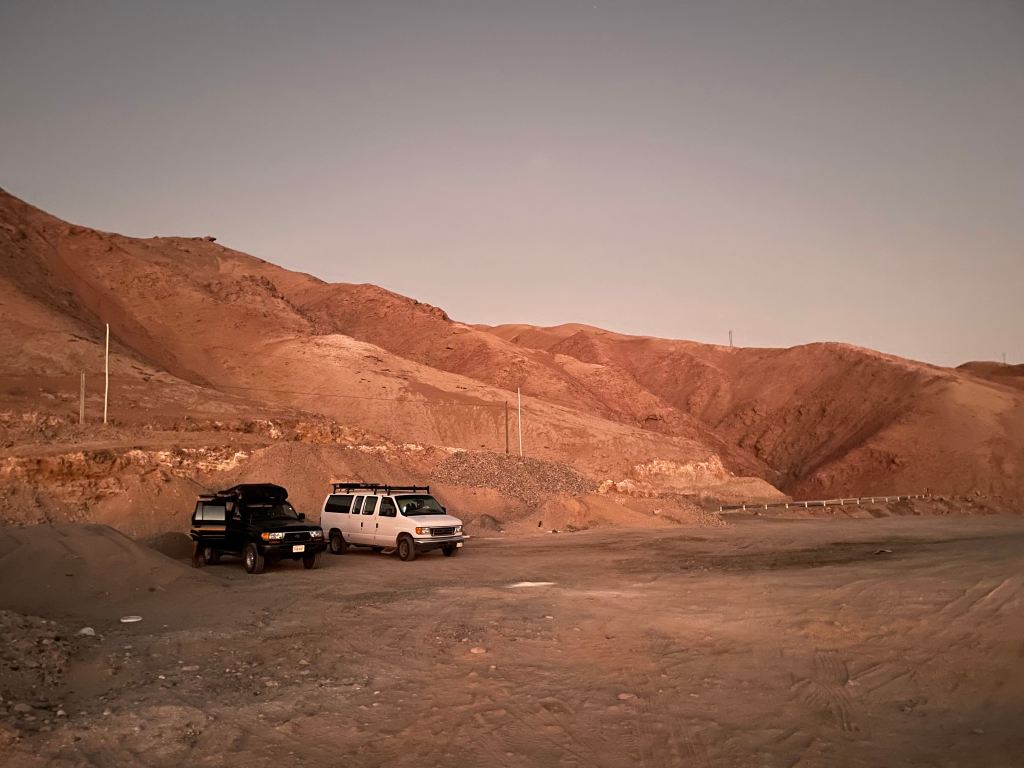 Fortunately we meet with a couple of other travellers, Sam and Anna, who were also driving south and in the same predicament. We resolved to convoy together to the border. The first day went well and we all camped on a cliff top overlooking the Pacific Ocean. However the next day things started to look bad. Anna was from Colombia and was able to get news from other drivers as we went. Our preferred route to the border was via the coast but we heard that this highway had been blocked off by angry protestors and traffic was backed up for miles. We took a less direct inland route and heard from a gas station attendant that the way to the border was 50/50 but that at 8am the next morning protestors were going to completely shut everything down. By this time it was 10pm at night and the golden rule in South America is never to drive at night. However, we kinda had no choice, we had to risk it, especially since it was only about another 100km. Thus began a 6 hour ordeal of navigating active and inactive roadblocks. At one stage we formed a little convoy with some local drivers who took us across 4WD trails to dodge a closed toll station. Our van got stuck in the sand on a nasty corner and we had to dig out a spinning back wheel. All the time we were having to drive through roads covered with rocks and burning tyres, some of which the protestors had removed to create a sort of channel that cars could pass through. Finally reached the Chilean border at 4AM, having been desperately driving for 20 hours. We crawled into the back of the van and collapsed to sleep, until 6:30am, when the border opened. We’d made it, but it’d been close.